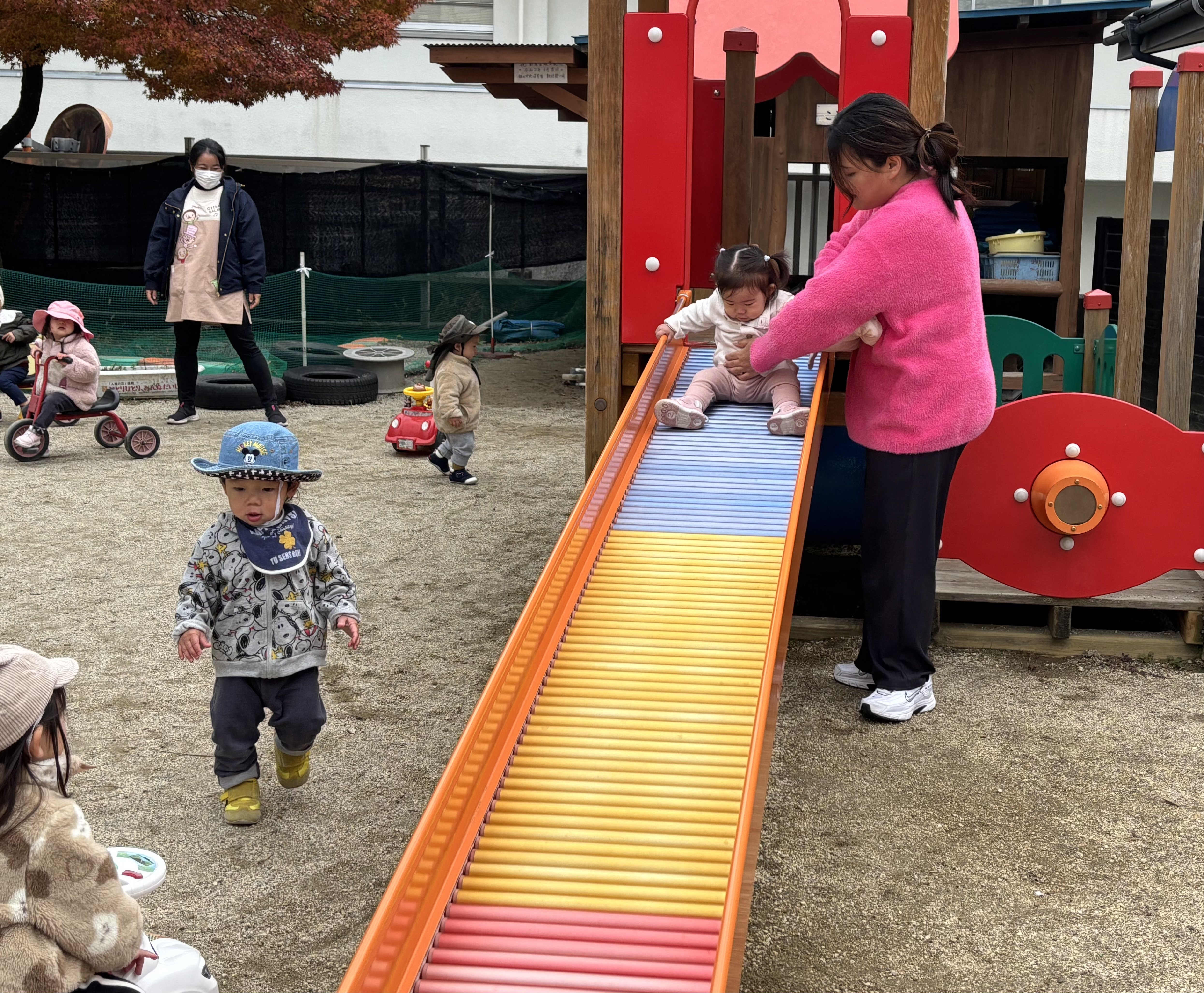 初めての遊具に慎重な姿も見られましたが、一度滑ると面白かったようで何度も滑り台を滑ったり、お友だちが蹴っているボールを一緒に追いかけたりとたくさんのお友だちから刺激を受けながらお庭をいっぱい歩き遊びました。