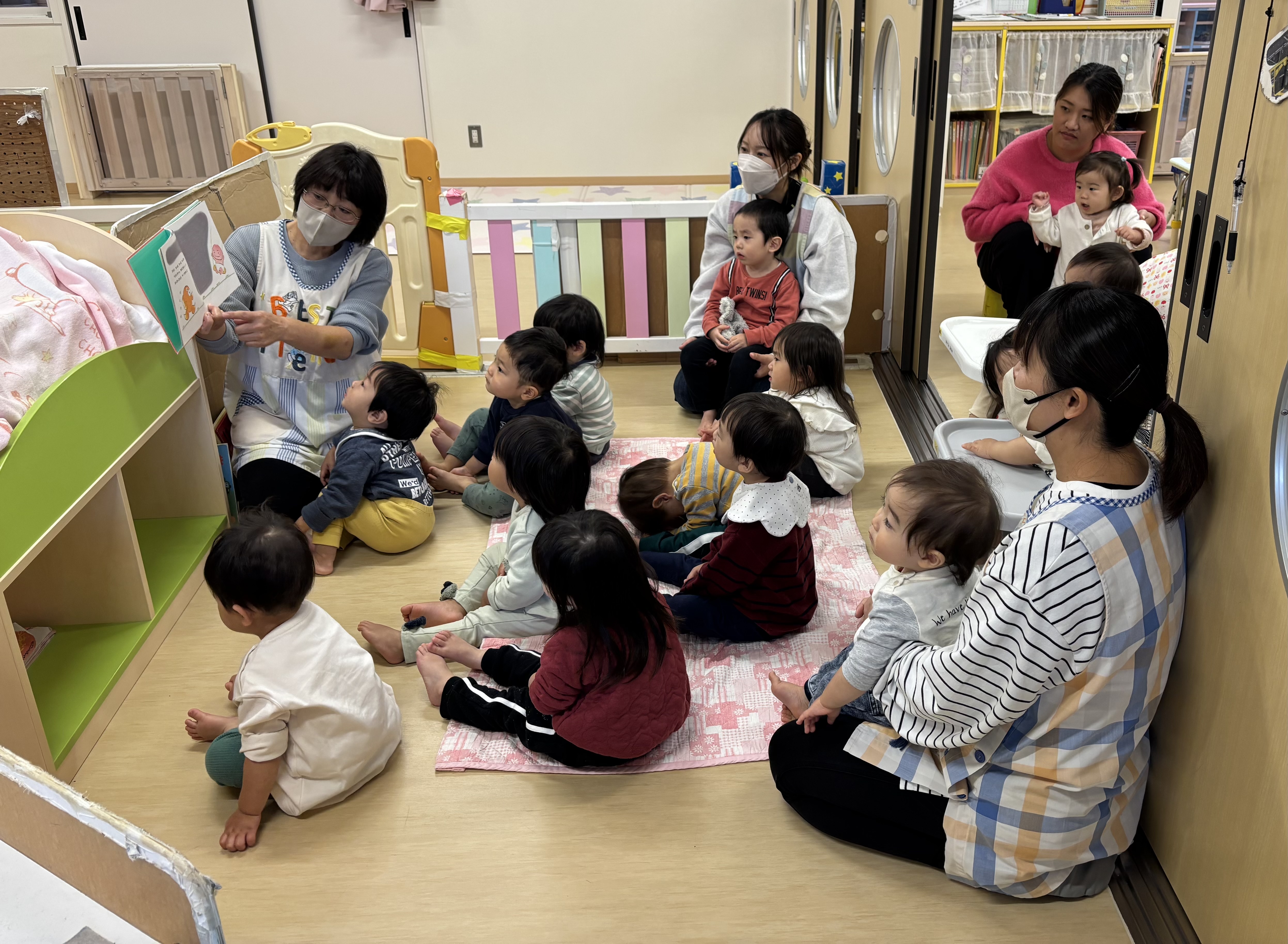 初めての場所でしたがお母さんも一緒ということもあってかニコニコでお部屋に入り、歌に合わせて手を叩いたり、おやつも食べ、時折お友だちの顔を覗き込んで興味深々の姿が見られました。