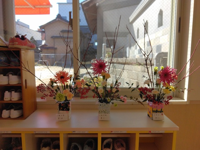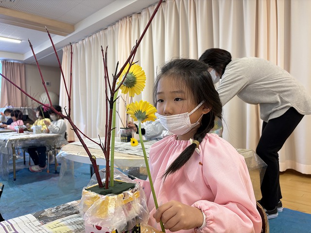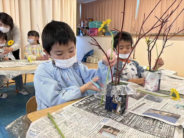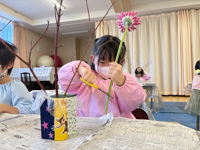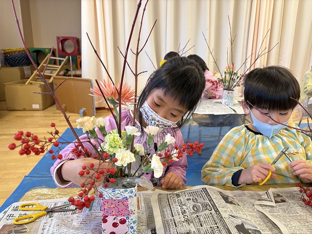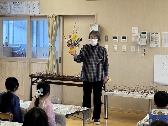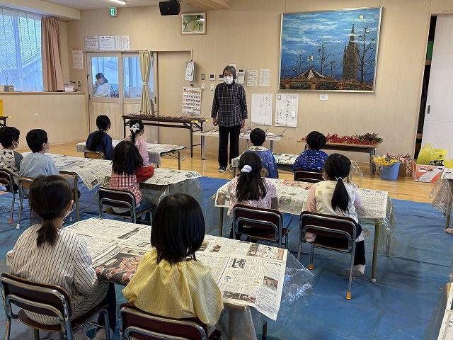 12月16日(火)年長組が生け花教室を体験しました。講師は生け花のお稽古に通った経験のある園長先生です。