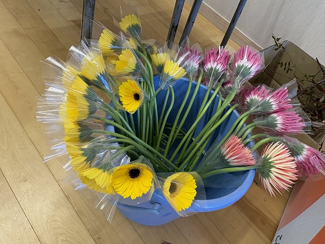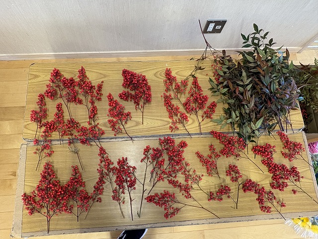 今回は牛乳パックを飾り付けて作った花器に、さんごみずき、ガーベラ、カーネーション、南天と、お正月をイメージしたアレンジで活けました。どの角度でどんな長さで活けたらきれいに見えるか等、自分でよく見て考えながら進めていきました。同じ材料で、同じように話を聞いて活けていきましたが、それぞれの思いで個性豊かに出来上がりました。