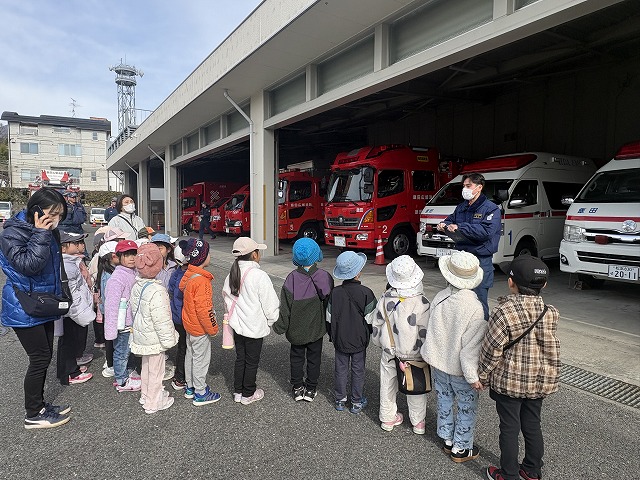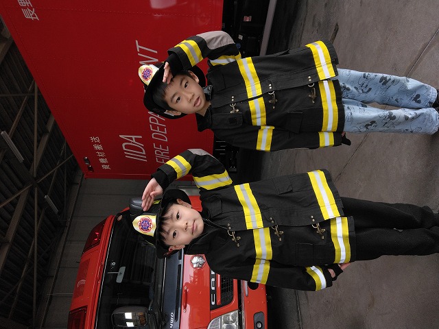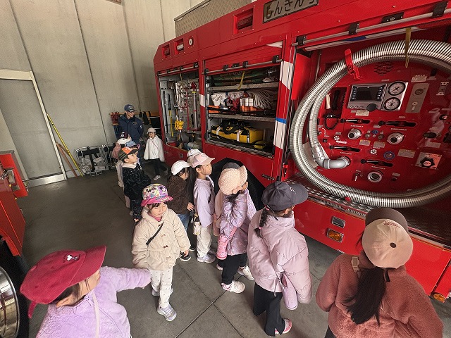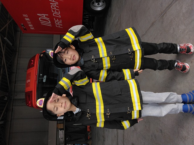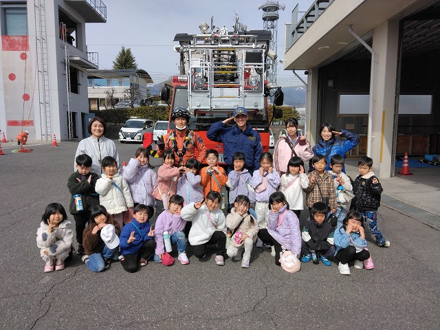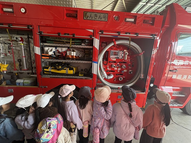 2月24日(火) 年長組が飯田消防署へ見学に行ってきました。ドキドキワクワクしながら歩くこと30分。見えてきました!何人もの消防士さんが待っていてくださいました。元気よく挨拶をし早速消防車や救急車の説明をお聞きしました。救急車の中に入らせていただくと、「家の車にはない物がのってる!」「いろいろな機械がついてる!」「これは何するものなんだろう?」興味津々でじっくり見学しました。サイレンの音や点滅するランプの訳も教えていただき皆納得。35メートルも伸ばせるはしご車には大きな歓声が上がりました。