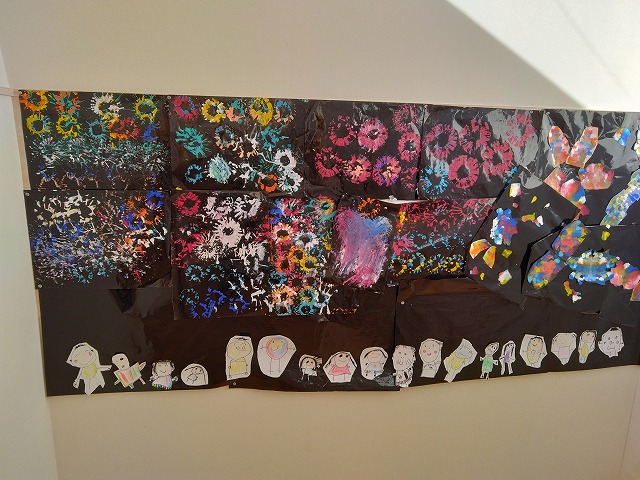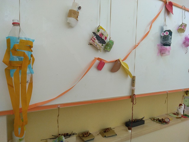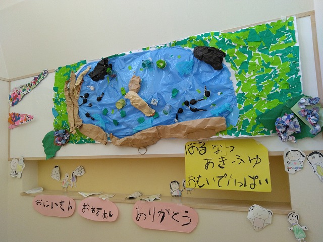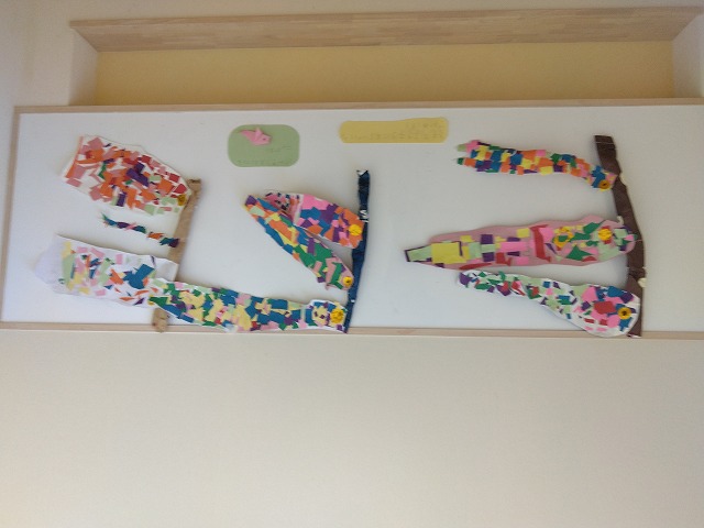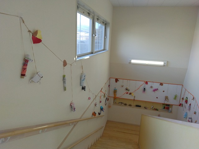 1年間3歳以上児が季節に合わせて工夫して作品を作り、階段踊り場の壁面を彩ってくれました。
